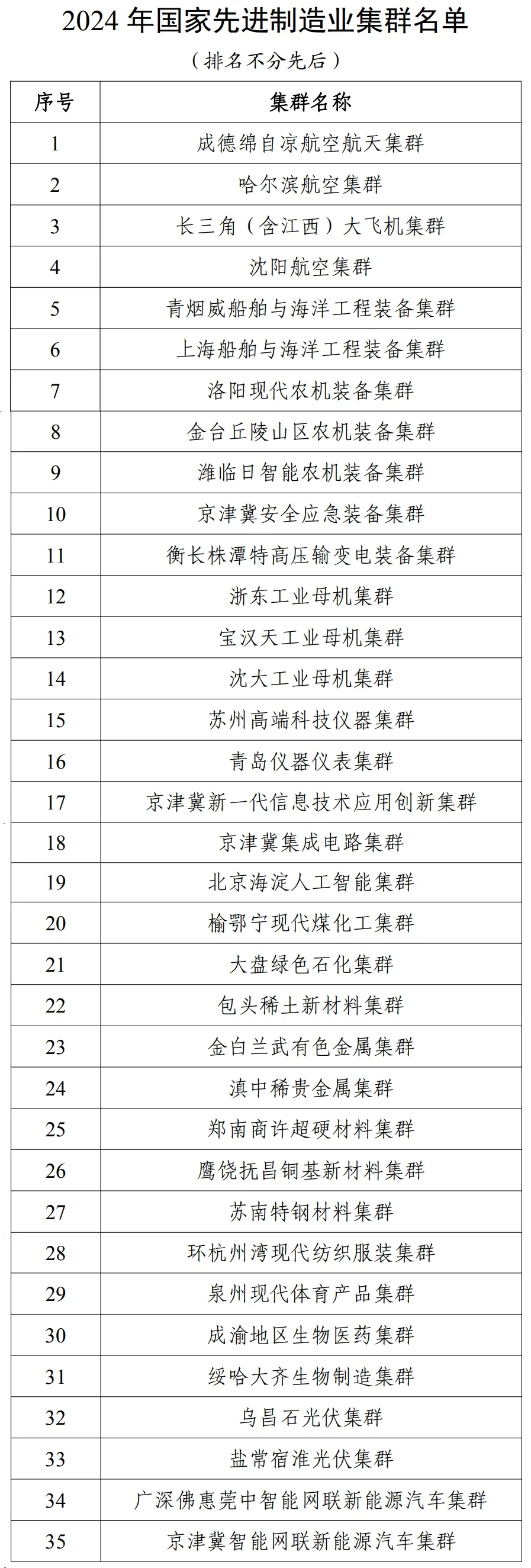 近日,和信息化部公布《2024年國家先進制造業(yè)集群名單》,共計35個集群上榜,包括蘇州高端科技儀器集群、青島儀器儀表集群、廣深佛惠莞中智能網(wǎng)聯(lián)新能源汽車集群、京津冀智能網(wǎng)聯(lián)新能源汽車集群等。