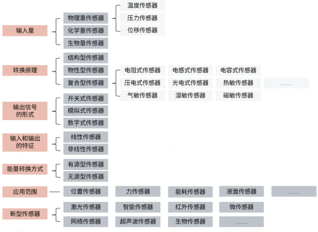 傳感器種類眾多,并且可以按照輸入量、轉(zhuǎn)換原理、輸出信號、輸入和輸出的特征、能量轉(zhuǎn)化方式、應(yīng)用范圍等多種方式分類。例如,按照輸入量,可分為物理量、化學(xué)量、生物量傳感器;按照轉(zhuǎn)換原理,可分為結(jié)構(gòu)型、物性型、復(fù)合型傳感器;按照應(yīng)用范圍,可分為位置、力、液面、能耗、速度、溫度等傳感器。