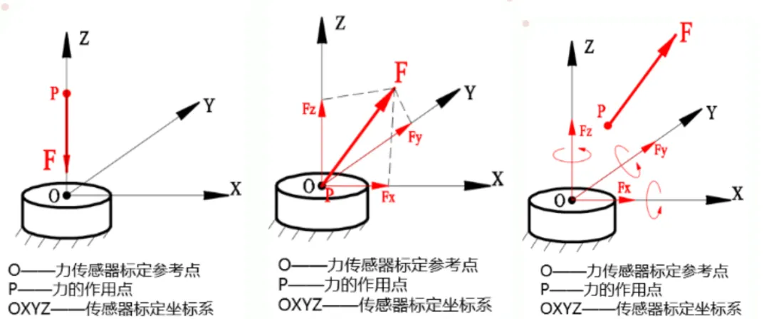 圖5:一維、三維、六維力矩傳感器(從左至右)作用示意圖