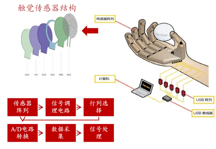 機(jī)器人觸覺與視覺一樣,基本上是模擬人的感覺。利用觸覺可進(jìn)一步感知物體的形狀、軟硬等物理性質(zhì),從而實現(xiàn)抓取等動作。一般把檢測感知與外部直接接觸而產(chǎn)生的接觸覺和壓力等信息的傳感器稱為機(jī)器人觸覺傳感器,通過將信號從其他物理波形轉(zhuǎn)換成電流或電壓波形,然后通過數(shù)字電路對波形進(jìn)行處理,并以電磁波的形式傳輸,再由另一個傳感器接收和轉(zhuǎn)換成需要的信號形式來工作。觸覺傳感器主要分為柔性和剛性(MEMS為主),但柔性傳感器是人形機(jī)器人行業(yè)的主流研究和投入方向,根據(jù)原理不同可分為電容、電感、壓阻等5種,目前壓阻式相對主流。電子皮膚(E-skin)是柔性傳感器的重要應(yīng)用,被視為未來技術(shù)發(fā)展方向,在人形機(jī)器人觸覺方案中得到較多關(guān)注。