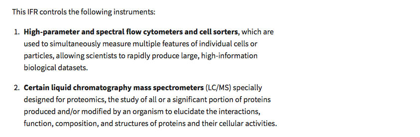 《科創(chuàng)板日報》1月16日訊(特約記者 高青 記者 徐紅) 當(dāng)?shù)貢r間1月15日,美國商務(wù)部工業(yè)安全局(BIS)發(fā)布了一項臨時最終規(guī)則(IFR),擬對某些科學(xué)儀器實施有針對性的出口管制,包括高參數(shù)流式細胞儀(high-parameter flow cytometers)和液相色譜-質(zhì)譜聯(lián)用儀(GC/MS)等某些質(zhì)譜設(shè)備(mass spectrometry)。