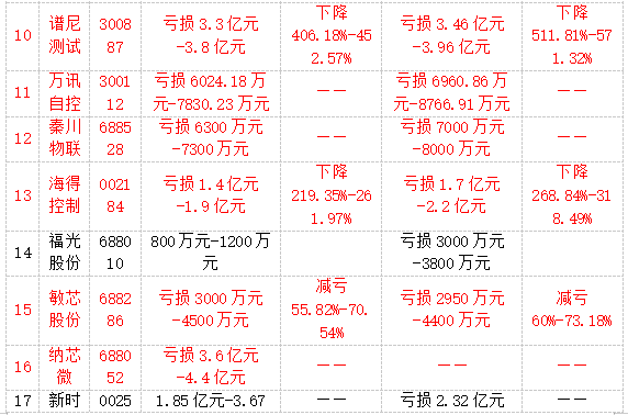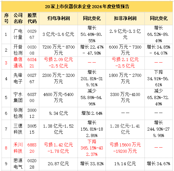 已披露業(yè)績預告的20家儀器儀表企業(yè)中,歸母凈利潤預虧的有9家。預計虧損超過億元的分別為:鼎信通訊預計虧損2.09億元-2.5億元;禾川科技預計虧損1.42億元-1.78億元;譜尼測試預計虧損3.3億元-3.8億元;納芯微預計虧損3.6億元-4.4億元。禾川科技和譜尼測試預降最多,分別為365.15%-432.37%、406.18%-452.57%。