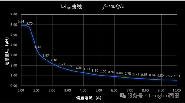 相同頻率下,電感器會隨著直流電流增加電感量逐步下降,直至磁飽和狀態(tài)。