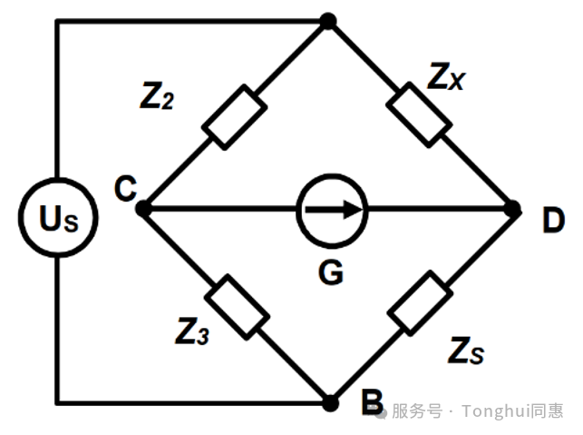 當沒有電流通過檢測器(G)時,被測阻抗Zx值可從與其它電橋元件的關系獲得。