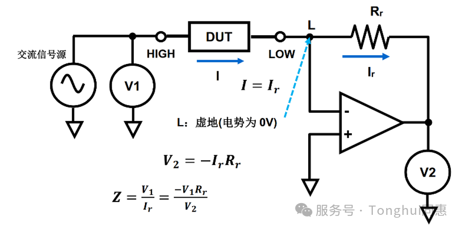 交流信號源流過 DUT 的電流也流過運算放大器反饋電阻Rr,“L”為虛地,電位保持為 0V。I-V轉換放大器使Rr上的電流Ir與 DUT 上的電流I相等。測量高端電壓V1和 R 上的電壓V2, 即可計算出 DUT 的阻抗。