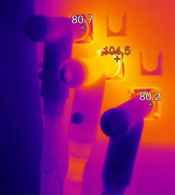 在下面的例子中,您可以看到帶有缺陷的暴露終端和覆蓋終端之間的溫差。在第一組試驗(yàn)中,故意損壞一個(gè)終端,并使其承受100A的電流持續(xù)75分鐘。第二張圖像顯示了安裝屏蔽罩的相同終端,以顯示兩個(gè)區(qū)域之間的加熱模式和增量。