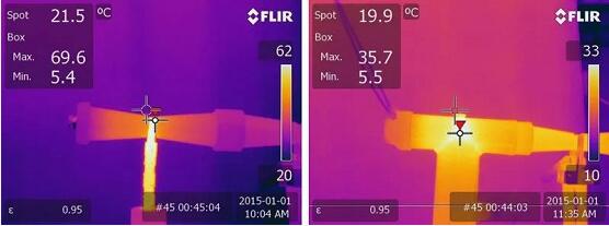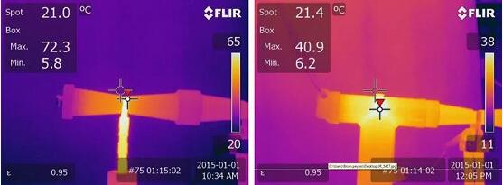在下面的例子中,您可以看到帶有缺陷的暴露終端和覆蓋終端之間的溫差。在第一組試驗中,故意損壞一個終端,并使其承受100A的電流持續(xù)75分鐘。第二張圖像顯示了安裝屏蔽罩的相同終端,以顯示兩個區(qū)域之間的加熱模式和增量。