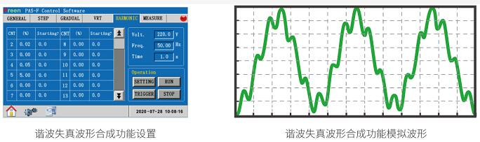 使用者能透過(guò)搭配的7吋觸摸屏來(lái)設(shè)置相關(guān)參數(shù),以基頻50Hz與60Hz來(lái)編程多階的諧波成分,可詳細(xì)設(shè)定每一階的電壓震幅大小及輸出起始相位,結(jié)合成需求的失真波形。使待測(cè)物能在符合標(biāo)準(zhǔn)的環(huán)境下測(cè)試,讓測(cè)試結(jié)果更為準(zhǔn)確。