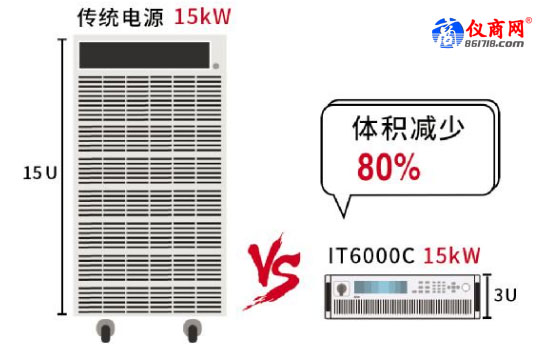 突破二:大功率小體積,節(jié)約實驗室空間,動力電池功率一般高達40KW~50KW,若按照傳統(tǒng)的方案配齊一套充放電的設備,則會占用約3個37U的機柜,而使用IT6000系列設備,以15KW為例,體積可以減小到3U,極大的節(jié)省了實驗室空間。