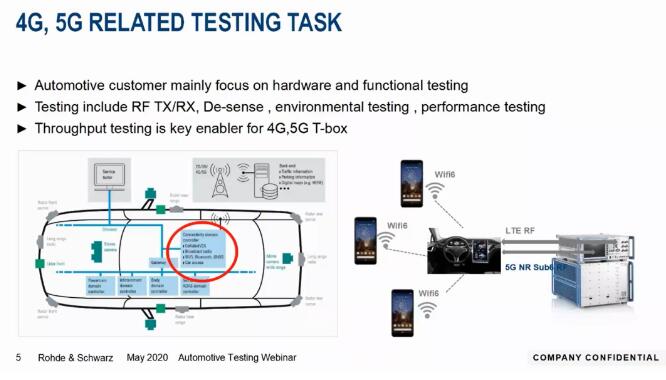 汽車T-box都會(huì)同時(shí)支持2/3/4/5G和Wifi/BT等通信技術(shù),典型應(yīng)用是汽車T-Box通過(guò)5G網(wǎng)絡(luò)為車內(nèi)提供網(wǎng)絡(luò)信號(hào)。羅德與施瓦茨演示了用一套綜測(cè)儀測(cè)試T-Box的5G和Wifi這種典型應(yīng)用。