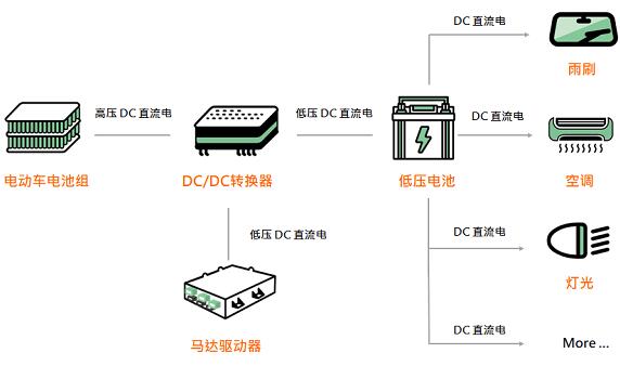 DC/DC轉(zhuǎn)換器可將接收到的直流電源轉(zhuǎn)換為不同電壓的直流電源,并為所連接的負(fù)載提供穩(wěn)定的電壓來源。在電動(dòng)車領(lǐng)域中,負(fù)責(zé)將高壓電池組的能量轉(zhuǎn)換至低壓電池中,為汽車的空調(diào)、燈光、雨刷、音響、導(dǎo)航等12-48V的低壓設(shè)備供電。