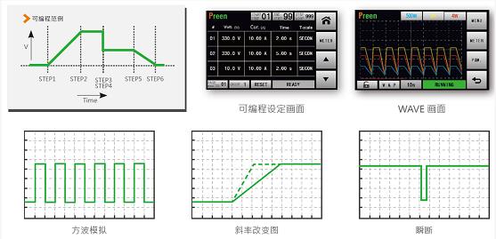 ? 瞬時(shí)反應(yīng)與開關(guān)機(jī)時(shí)間測(cè)試:以低紋波、高精度、高穩(wěn)壓率的特性,搭配快速的反應(yīng)速度和爬升率,適合高效率地模擬各種直流電源測(cè)試。