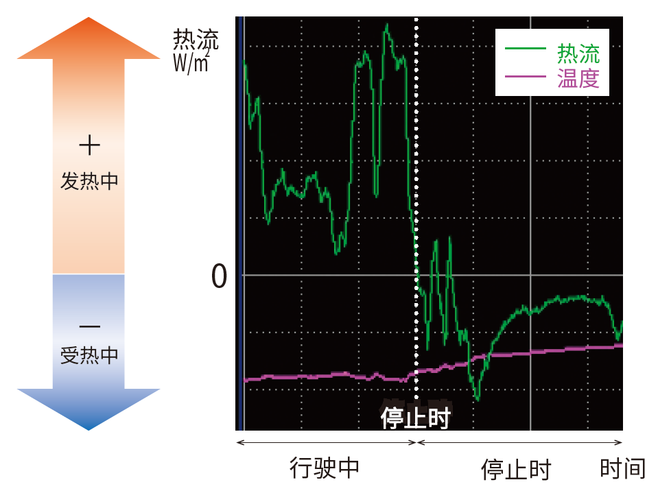 Fig.1 是使用LR8450和市售熱流傳感器,對(duì)正在行駛中的車(chē)輛的零部件進(jìn)行溫度和熱流測(cè)量時(shí)的畫(huà)面??梢钥吹綔囟日诰徛掷m(xù)升高,與之相對(duì)的是,圖表中熱流的顯示在車(chē)輛停止時(shí)發(fā)生了一些變化。