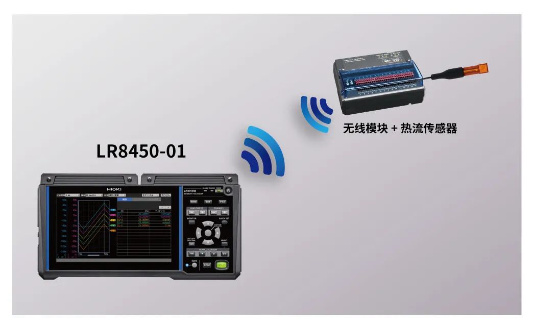 使用帶無(wú)線LAN功能LR8450-01,無(wú)線模塊和設(shè)備主機(jī)間能夠進(jìn)行無(wú)線連接。將連接了熱流傳感器的無(wú)線模塊設(shè)置在測(cè)量對(duì)象的附近,便能夠在實(shí)驗(yàn)室里對(duì)進(jìn)行遠(yuǎn)程監(jiān)測(cè)。