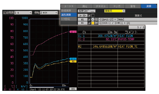 熱流傳感器靈敏度常數(shù)是具備溫度依賴性。例如,在測(cè)量對(duì)象溫度為120℃時(shí)進(jìn)行熱流測(cè)量,數(shù)值可能會(huì)產(chǎn)生20%左右的誤差。使用溫度測(cè)量值,能夠依靠LR8450的波形運(yùn)算功能進(jìn)行溫度補(bǔ)償,從而實(shí)現(xiàn)高精度的熱流測(cè)量。