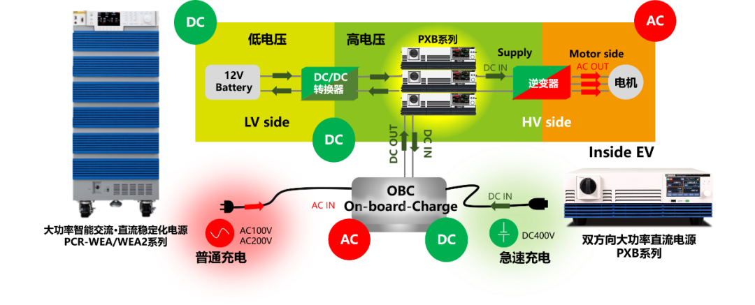 菊水的雙方向大功率直流電源PXB系列除了可以評估上記的車載逆變器與電機(jī),還可對OBC(車載充電器)進(jìn)行評估。PXB系列可作為高電壓模擬電池,進(jìn)行紋波測量。也可以作為新能源汽車的快充電用的高電壓電源。然而作為家用220V慢充用的電源可以使用另一款菊水產(chǎn)品——大功率交流·直流穩(wěn)定化電源PCR-WEA/WEA2系列。
