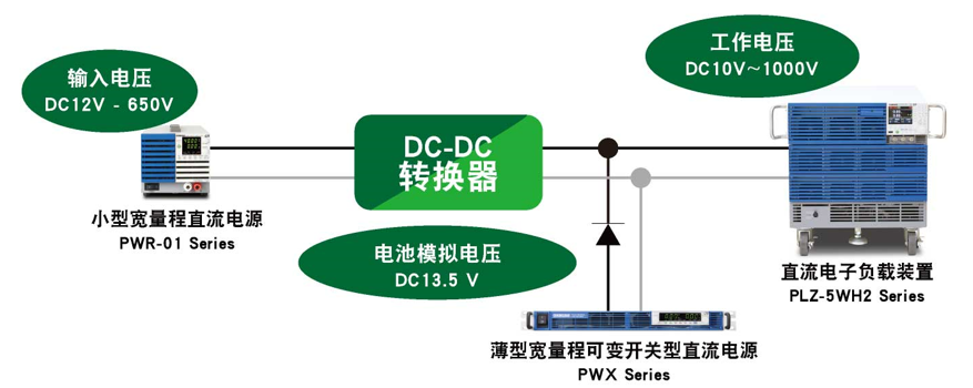 通過轉(zhuǎn)換器輸入(直流電源)與轉(zhuǎn)換器輸出(電子負(fù)載裝置),就可以簡單的對車載電子部件的功率輸出源DC-DC轉(zhuǎn)換器的性能進(jìn)行評估試驗。除此以外,由于直流電源與電子負(fù)載裝置可以同時運行,所以還可進(jìn)行DC-DC轉(zhuǎn)換器的輸出入變動試驗以及效率試驗。