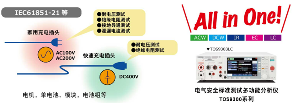 同時可支持AC與DC。并且從EV的電池到車載充電器、充電連接器均可對應(yīng)??伸`活應(yīng)對車載相關(guān)的電氣安全標(biāo)準(zhǔn)要求!如使用多功能型號TOS9303LC,使用一臺就均可滿足!
