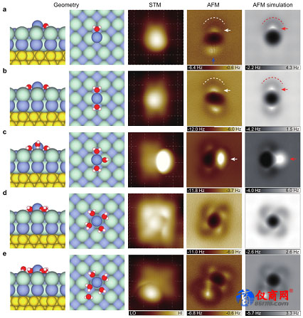 圖為鈉離子水合物的亞分子級分辨成像。從左至右,依次為五種離子水合物的原子結(jié)構(gòu)圖、掃描隧道顯微鏡圖、原子力顯微鏡圖和原子力成像模擬圖。