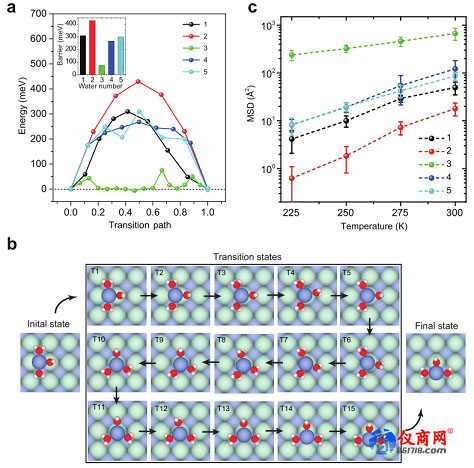 圖為鈉離子水合物在NaCl表面輸運的幻數(shù)效應(yīng)。a,第一性原理計算得到的不同離子水合物擴散的勢壘;b,第一性原理計算得到的含有三個水分子的鈉離子水合物的擴散過程;c,分子動力學(xué)模擬得到的不同離子水合物在225K-300K下1ns時間內(nèi)擴散的均方位移。