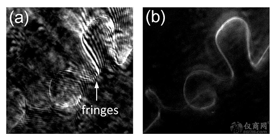 圖1a所示為在自主搭建的光學(xué)顯微鏡上加載了旋轉(zhuǎn)照明模塊。利用掃描振鏡精確、高速的調(diào)節(jié)光束入射角度,在保持徑向角度(θ對(duì)應(yīng)表面波的共振激發(fā)角度)不變的情況下,讓方位角在0°到360°之間高速旋轉(zhuǎn)(圖1b),進(jìn)而在各個(gè)方向激發(fā)傳播的SPs。無需圖像處理,利用探測(cè)器采集圖像的時(shí)間平均效應(yīng)可自然地提高SPRM成像分辨率。如圖2a所示,被成像樣品是一根彎曲介質(zhì)納米線,利用常規(guī)的SPRM只能看到模糊的圖案,并有很多條紋造成的假象;而利用旋轉(zhuǎn)照明SPRM,可有效分辨出此納米線的形貌和彎曲(圖2b)。對(duì)比實(shí)驗(yàn)證明,旋轉(zhuǎn)照明有效提高了SPRM成像分辨率,解決了目前SPRM存在的第一個(gè)不足之處。