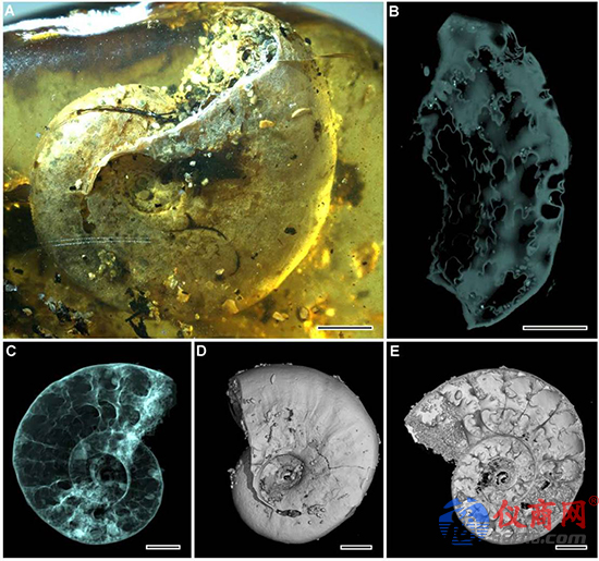 例如此次“菊石”琥珀的研究中,為了獲得琥珀中菊石的完整形態(tài)數(shù)據(jù),就采用了X射線微型計(jì)算機(jī)斷層掃描技術(shù),借助X射線的穿透能力,結(jié)合計(jì)算機(jī)算法,在基本不破壞琥珀的前提下,或者高分辨率的菊石三維圖像,便于后續(xù)菊石的特征分析。