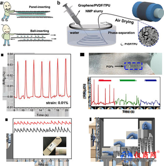 為了解決這些難題,中國科學(xué)院上海微系統(tǒng)與信息技術(shù)研究所研究員丁古巧課題組提出了通過結(jié)構(gòu)化設(shè)計(jì)減少石墨烯與高分子接觸面積來提高靈敏度的策略。他們利用石墨烯/聚偏氟乙烯/聚氨酯DMF體系在水相的相分離過程,制備了高分子納米球修飾的石墨烯多孔網(wǎng)絡(luò)纖維,這種結(jié)構(gòu)大幅增強(qiáng)了該纖維在發(fā)生形變時(shí)石墨烯片層之間的結(jié)構(gòu)變化,從而實(shí)現(xiàn)石墨烯基纖維靈敏度的顯著提高。其靈敏度因子值在0-5%應(yīng)變時(shí)為51,在5-8%應(yīng)變時(shí)達(dá)到87,通過編織集成,他們進(jìn)一步驗(yàn)證了該纖維在人體重要信號(hào)收集的準(zhǔn)確性和對(duì)不同動(dòng)作狀態(tài)分析的可行性。同時(shí),這種新型石墨烯基纖維傳感器最低形變檢測(cè)限達(dá)到0.01%,較好的應(yīng)變-電阻線性關(guān)系可保證在信號(hào)后處理上的準(zhǔn)確性,>6000次的循環(huán)壽命有利于實(shí)際應(yīng)用的穩(wěn)定性。