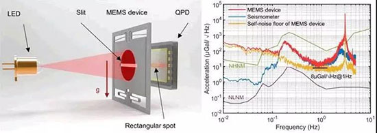 (左)光學(xué)位移傳感器工作原理圖;(右)MEMS重力儀噪聲水平測(cè)試。