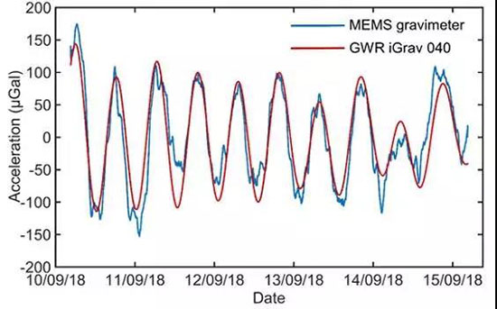 潮汐信號(hào)是地面物體受到太陽(yáng)、月球引力變化產(chǎn)生的,是一種常見(jiàn)的引起重力加速度變化的現(xiàn)象。由于它的幅度在百μGal,周期為12小時(shí)和24小時(shí),通常把對(duì)潮汐的檢測(cè)作為衡量重力儀的重要指標(biāo)。研究人員把制作的MEMS重力儀放置在實(shí)驗(yàn)室中進(jìn)行長(zhǎng)期測(cè)試,數(shù)據(jù)結(jié)果與實(shí)驗(yàn)室中商用超導(dǎo)重力儀比較,5天的數(shù)據(jù)表明(圖3),兩者測(cè)到的潮汐信號(hào)相關(guān)系數(shù)為0.91.