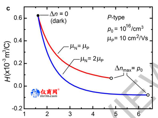其中的 μH是兩種載流子霍爾遷移率之差,H 是霍爾系數(shù),σ 是電導(dǎo)。這成為了解決問題的金鑰匙,基于這個(gè)方程能夠?qū)⒂嘘P(guān)兩種載流子的 7 種不同參數(shù)推出,包括濃度、遷移率、擴(kuò)散長度和載流子壽命等。