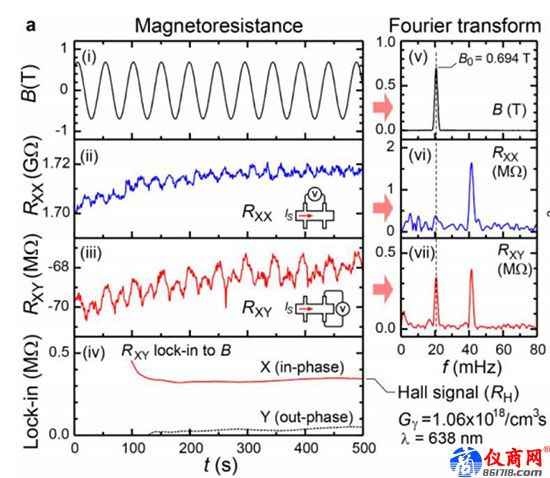 因此,Gunawan 采用了交流(振蕩)磁場并連接傅里葉分析進(jìn)行霍爾測量。如下圖,通過傅里葉變換,可以找到信號最明顯的地方,再進(jìn)行分析就好,這就好像是在收音機(jī)中找你最喜歡的電臺一樣,其他頻率都是噪聲,而特定的頻率就會有電臺節(jié)目。