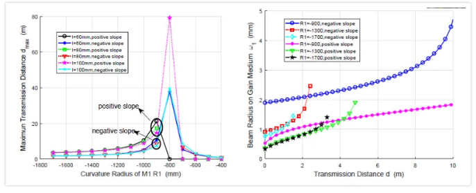 圖2 (a) 最遠(yuǎn)的能量傳輸距離與M1曲率的關(guān)系;(b) 增益介質(zhì)上的光斑尺寸與傳輸距離的關(guān)系。
