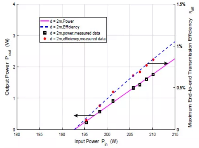 圖3 輸出功率和輸入電功率的關(guān)系(紅色實(shí)線);傳輸效率(藍(lán)色虛線)。