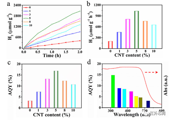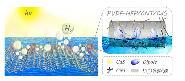 紅外光約占據(jù)太陽光光譜的50%,由于其光子能量較低無法直接激發(fā)光催化反應(yīng)而未受重視,而光熱技術(shù)可以將紅外光轉(zhuǎn)化為熱能,且轉(zhuǎn)化率高達85%。鐵電材料可依賴溫度變化在其表面形成正和負的熱釋電電場,電場可以作為驅(qū)動力有效調(diào)控載流子的遷移行為。那么,如果將光熱材料和熱釋電材料與光催化劑進行復(fù)合,構(gòu)筑熱釋電-光熱-光催化復(fù)合體系,紅外光將會得到有效利用并產(chǎn)生熱釋電內(nèi)建電場促進光催化分解水產(chǎn)氫性能的提高?;诖?,該研究團隊創(chuàng)新性地設(shè)計并構(gòu)筑了熱釋電-光熱-光催化復(fù)合微米纖維PVDF-HFP/CNT/CdS,實現(xiàn)了紅外光響應(yīng)熱釋電電場的構(gòu)筑并顯著提高光催化分解水制氫效率達5倍以上,對應(yīng)的平均表觀量子效率約為16.9%。研究團隊探討了熱釋電基底、光熱材料含量等與熱釋電電勢輸出及光催化性能的關(guān)聯(lián),并對復(fù)合螺旋纖維的光催化穩(wěn)定性進行了探索。