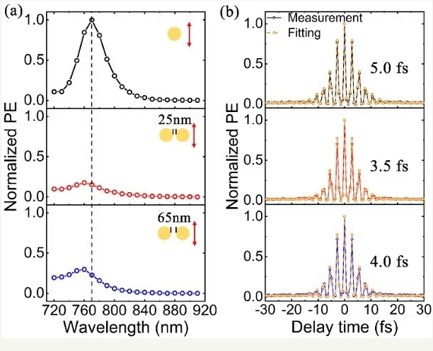在表面等離激元光子學實驗中,利用PEEM高空間分辨率的優(yōu)勢直接觀測到金納米結(jié)構(gòu)二聚體陣列體系中局域表面等離激元模式的近場分布(圖1),通過激發(fā)光波長依賴的光發(fā)射強度測量和基于超短脈沖的光發(fā)射自相關(guān)測量,分別獲得同一結(jié)構(gòu)的表面等離激元的近場增強和退相干時間,發(fā)現(xiàn)兩者之間的關(guān)聯(lián)依賴于金納米結(jié)構(gòu)二聚體間隙和激發(fā)光的偏振方向(圖2和圖3),首次揭示出這種關(guān)聯(lián)性由近場遠場耦合和納米結(jié)構(gòu)局域作用共同決定。