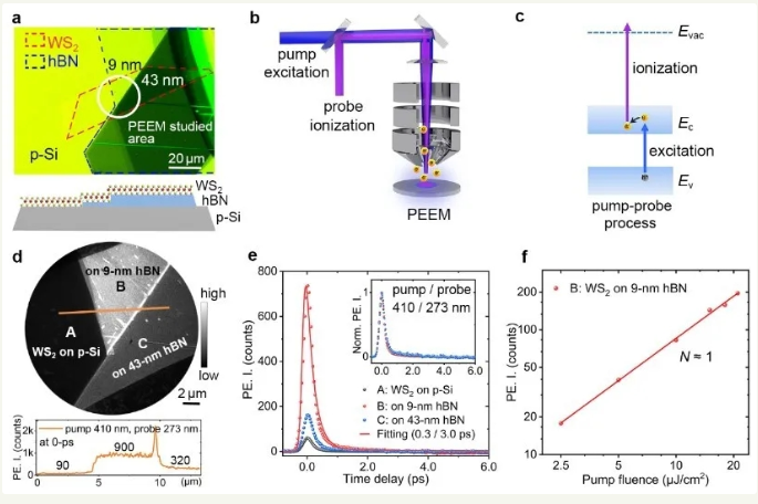 圖4 WS2/hBN/p-Si樣品結(jié)構(gòu)和時間分辨PEEM測量。