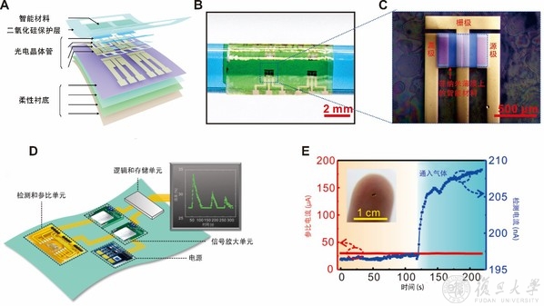 圖1:(A) 器件主要功能層示意圖;(B) 貼附于曲面上的柔性傳感器件陣列;(C) 智能傳感器件功能區(qū)的光學(xué)顯微照片;(D)用于濕度傳感的集成系統(tǒng)構(gòu)造圖;(E) 氫氣通入前后參比器件與檢測器件的電流變化,紅色為參比電流,藍(lán)色為檢測電流。