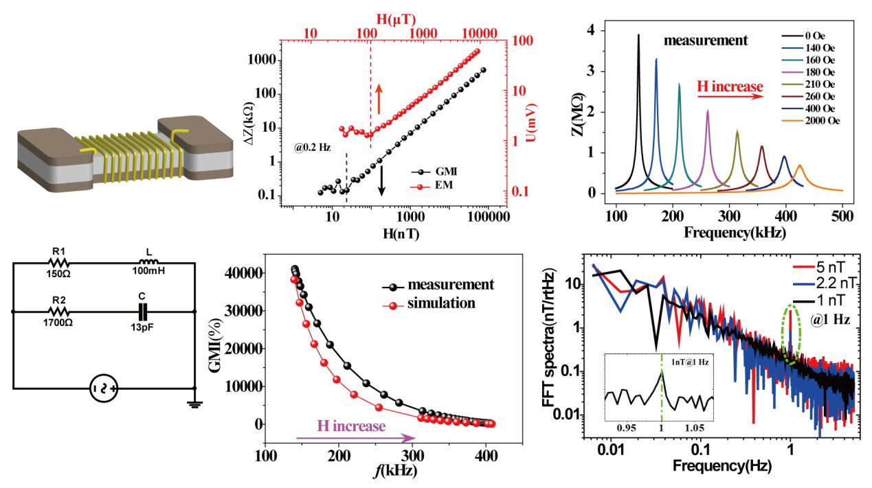 近日,西安交通大學(xué)電信學(xué)部電子科學(xué)與工程學(xué)院劉明教授課題組開發(fā)了一種基于傳統(tǒng)磁芯繞線電感的新型高靈敏度GMI傳感器。傳統(tǒng)磁芯螺線圈制成的線圈感應(yīng)磁強(qiáng)計(jì),根據(jù)法拉第電磁感應(yīng)定律,通過線圈的磁通量變化帶來感應(yīng)電流及電壓的變化,可以制成具有fT靈敏度的磁場(chǎng)傳感器,但是其缺點(diǎn)在于體積大且不能探測(cè)靜態(tài)磁場(chǎng)。本課題組采用全新的探測(cè)模式,通過單一的電感器件構(gòu)建了LC諧振電路,可以實(shí)現(xiàn)諧振頻率附近41036%的磁阻抗變化,遠(yuǎn)高于傳統(tǒng)磁阻器件普遍小于100%的變化率。同時(shí),新型GMI相比傳統(tǒng)GMI器件,可以將驅(qū)動(dòng)頻率降低到kHz量級(jí),并可以實(shí)現(xiàn)靜態(tài)磁場(chǎng)的測(cè)試。采用市場(chǎng)上直接購買的普通電感(成本<1元),可以實(shí)現(xiàn)磁場(chǎng)分辨力25nT@0.2Hz、10nT@1Hz。通過電路仿真優(yōu)化改進(jìn)后,研究人員將電感元件與電容串聯(lián),組成新的LC串聯(lián)型GMI傳感器,降低了驅(qū)動(dòng)信號(hào)頻率及器件本征阻抗,將磁場(chǎng)分辨力提高到625pT@1Hz(磁場(chǎng)大小約為地磁場(chǎng)的1/100000)。本研究所采用的電感及電容均為市面上的普通電子元件,通過材料及器件的優(yōu)化設(shè)計(jì),有望進(jìn)一步提高其探測(cè)靈敏度。新型GMI傳感器所具有的器件簡(jiǎn)單、成本低、靈敏度高等優(yōu)點(diǎn)預(yù)示了其重大的應(yīng)用潛力。