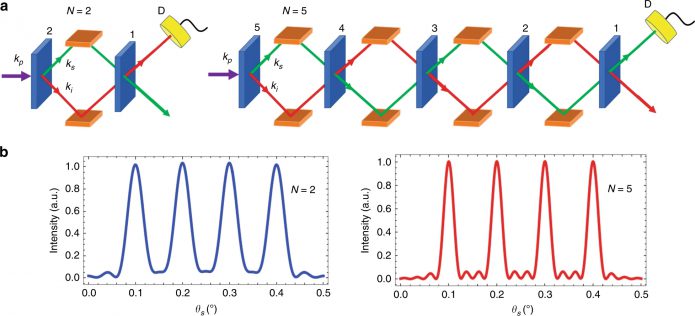 在最近發(fā)表的一篇論文中,Paterova和Krivitsky首次通過實驗證實高效的非線性干涉儀,該干涉儀由一系列非線性晶體超晶格組成的單相干激光泵浦構成(圖1a)。與兩晶體相比,五晶體中的魯棒性、穩(wěn)定性以及高可見度頻率-角譜得到良好控制(圖1b)。