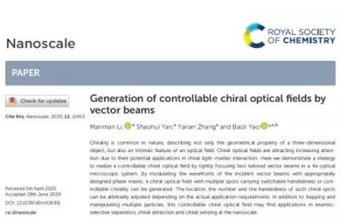 近日,西安光機所瞬態(tài)光學(xué)與光子技術(shù)國家重點實驗室姚保利研究員團隊在納米可控手性光場產(chǎn)生方面取得重要進展,相關(guān)研究成果以“Generation of controllable chiral optical fields by vector beams”為題,在線發(fā)表在國際著名期刊《Nanoscale》(IF6.90)上,標志著我所在光場調(diào)控基礎(chǔ)研究領(lǐng)域的工作和成果得到了國際同行的關(guān)注和認可。