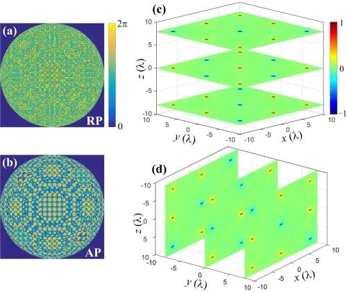 進一步,為了使產(chǎn)生的光場同時攜帶兩種手性,研究團隊利用由矢量衍射理論推導(dǎo)的解析方法代替常用的耗時且缺乏物理意義的迭代方法,設(shè)計了一種多相掩模板來對入射矢量光束進行相位調(diào)控,產(chǎn)生了同時攜帶兩種手性分布的1D、2D甚至3D的多光斑手性光場,光斑的位置、數(shù)量以及旋向均可通過多相掩模板進行任意調(diào)控。該研究結(jié)果將促進手性光場的應(yīng)用,為納米尺度上的對映體選擇性分離、手性傳感以及手性微粒操縱提供了可能。