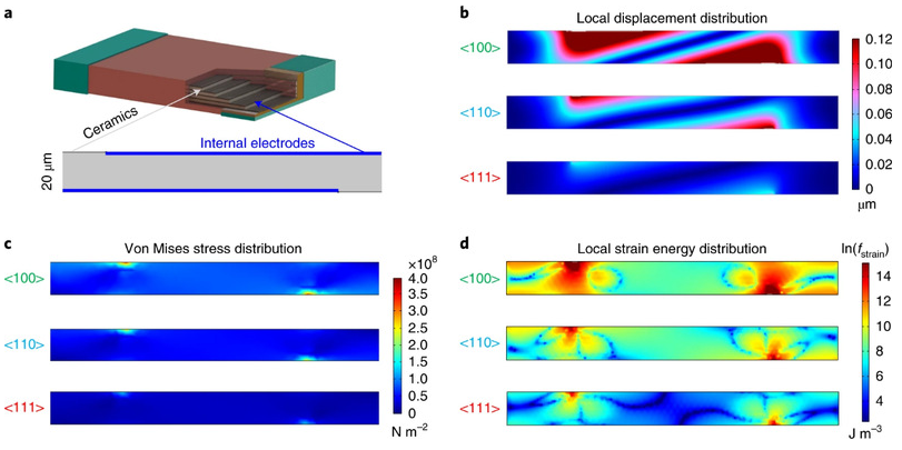 圖1 多層陶瓷電容器單個陶瓷層的應(yīng)變和彈性能分布的有限元模擬:(a) 陶瓷電容器和單陶瓷層示意圖;沿,和取向的鈣鈦礦樣品的(b) 局部位移、(c) 應(yīng)力局域分布和 (d) 局部彈性能密度。