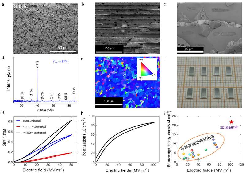 圖2多層織構(gòu)陶瓷電容器的取向結(jié)構(gòu)特征及其儲能特性:(a) 鈦酸鍶模板和(b, c)多層織構(gòu)陶瓷電容器的截面顯微照片;織構(gòu)陶瓷的(d) XRD圖譜和(e)晶粒取向分布圖;(f) 多層織構(gòu)陶瓷電容器照片;(g) 隨機取向以及分別沿和取向的多層陶瓷應(yīng)變與電場的關(guān)系;(h)取向多層陶瓷極化強度與電場的關(guān)系;(i)取向多層織構(gòu)陶瓷與文獻(xiàn)報道的陶瓷材料儲能密度對比。
