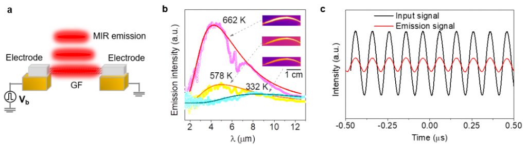 圖4. 石墨烯纖維的中紅外發(fā)射性能表征。(a)將石墨烯纖維懸空固定在金屬電極之間,輸入變頻偏壓使其發(fā)射中紅外光;(b)在不同溫度下,石墨烯纖維的發(fā)光光譜與理論的灰體輻射曲線相符;(c)發(fā)光頻率可以達(dá)到10兆赫茲。