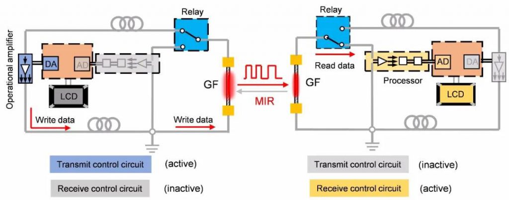 基于良好的發(fā)射和探測性能,作者以兩根同樣的石墨烯纖維構(gòu)建了雙向中紅外通訊系統(tǒng)。每根石墨烯纖維都與控制發(fā)射和接收的功能電路連接在一起,發(fā)射和接收電路的工作狀態(tài)通過繼電器實(shí)現(xiàn)自動(dòng)切換。左右兩根石墨烯纖維以一定的工作距離平行放置,以便傳輸和接收中紅外光。具體地,通過數(shù)字-模擬轉(zhuǎn)換和一系列的信號(hào)處理模塊向左側(cè)的纖維輸入一定頻率的數(shù)字信號(hào),使其發(fā)射相同頻率的中紅外光;同時(shí)右側(cè)的纖維接收中紅外光,并產(chǎn)生同步的光電流,再經(jīng)過信號(hào)處理和模擬-數(shù)字轉(zhuǎn)換模塊轉(zhuǎn)換成數(shù)字信號(hào)顯示在右側(cè)的顯示屏上。這樣就實(shí)現(xiàn)了中紅外信號(hào)從左側(cè)到右側(cè)的傳輸。右側(cè)纖維在接收完信號(hào)之后,可以對(duì)其輸入一個(gè)回復(fù)信號(hào)。此時(shí),右側(cè)纖維的控制電路會(huì)自動(dòng)通過繼電器切換到發(fā)射模式,左側(cè)纖維的控制電路切換到接收模式,實(shí)現(xiàn)回復(fù)信號(hào)從右側(cè)到左側(cè)的順利傳遞。
