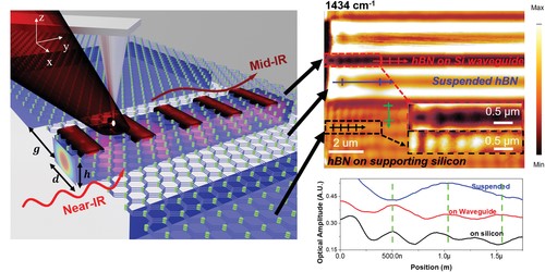 hBN材料以雙曲聲子極化激元的形式傳輸中紅外波。美國范德堡大學(xué)的研究人員首先數(shù)學(xué)建模,然后通過實(shí)驗(yàn)制造了混合型波導(dǎo):先將波導(dǎo)蝕刻到220 nm厚的硅片上,然后在上面轉(zhuǎn)移了40 nm厚的hBN層。研究團(tuán)隊(duì)借助掃描近場(chǎng)光學(xué)顯微鏡分析了通過異質(zhì)結(jié)構(gòu)的信號(hào)模式。