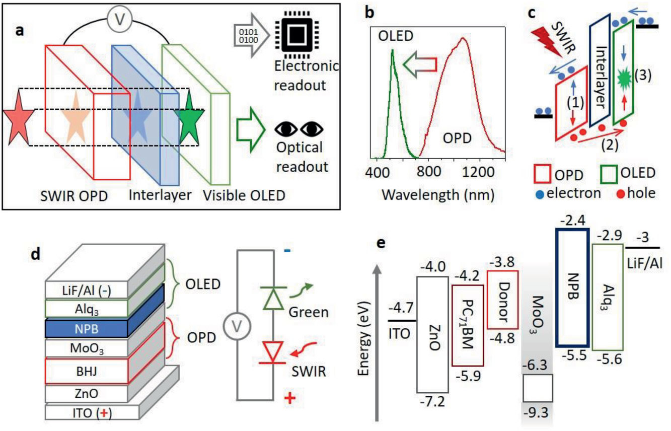 光電探測(cè)器層吸收短波紅外光或低能量光子,然后由于光電效應(yīng)產(chǎn)生電流,再流向OLED顯示層——電流被轉(zhuǎn)換成可見光圖像。阻擋電子層用于防止OLED顯示層在上轉(zhuǎn)換(Upconversion)過程中流失任何電流。這使得傳感器能夠產(chǎn)生更清晰的圖像。