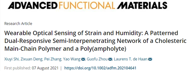 近日,華南師范大學(xué)先進(jìn)光電子研究院周國富教授團(tuán)隊(duì)Laurens T.de Haan研究員在可穿戴式刺激響應(yīng)性液晶光子傳感器研究方面取得重要進(jìn)展,相關(guān)研究成果發(fā)表于國際權(quán)威期刊《Advanced Functional Materials》(SCI影響因子:18.808)上,題為“Wearable Optical Sensing of Strain and Humidity: a Patterned Dual-responsive Semi-Interpenetrating Network of a Cholesteric Main-chain Polymer and a Poly(ampholyte)”。課題組碩士研究生石秀儀為論文的第一作者,Laurens T.de Haan研究員為通訊作者,周國富教授及王耀教授為共同通訊作者,華南師范大學(xué)為第一完成單位。