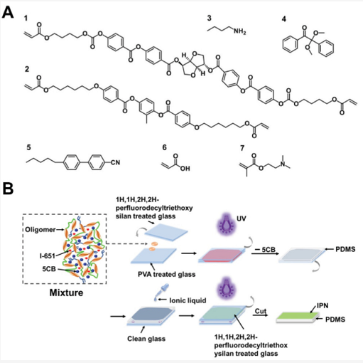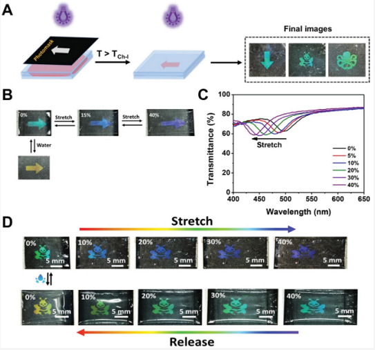 本工作提出了一種制備雙響應(yīng)光子傳感器的新策略,即將主鏈膽甾型彈性體和感濕性聚(兩性電解質(zhì))相互滲透以組成半互穿網(wǎng)絡(luò),不僅保留了主鏈聚合物的彈性和刺激響應(yīng)性,還獲得了第二聚合物的響應(yīng)性。在可見光范圍內(nèi),該薄膜在機(jī)械應(yīng)變和水響應(yīng)下顯示非常高的靈敏性、可逆性和穩(wěn)定性;在接觸水時(shí),由于聚(兩性電解質(zhì))吸水膨脹,彈性體中螺距增大反射顏色發(fā)生紅移;而當(dāng)施加應(yīng)變時(shí),由于薄膜徑向收縮,螺距減小反射顏色發(fā)生藍(lán)移;此外,通過在不同溫度下進(jìn)行局部光聚合可以制備特定色彩鮮艷的響應(yīng)圖像,并展示了其在人體汗液監(jiān)測(cè)和運(yùn)動(dòng)監(jiān)測(cè)中的應(yīng)用。該技術(shù)方法可以進(jìn)一步擴(kuò)展到主鏈液晶聚合物與其它響應(yīng)聚合物的結(jié)合,為開發(fā)多重刺激響應(yīng)智能材料提供了新思路。