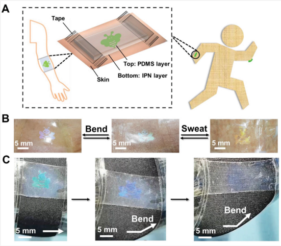 總之,本研究提出了一個(gè)光子傳感器,對(duì)機(jī)械應(yīng)變和水具有動(dòng)態(tài)顏色調(diào)諧響應(yīng)。這些傳感器是由一個(gè)主鏈CLCE和一個(gè)親水性聚(兩性電解質(zhì))網(wǎng)絡(luò)的連續(xù)聚合產(chǎn)生的SIPN產(chǎn)生的,后者是一個(gè)正負(fù)電荷附著在聚合物鏈上的聚合物。利用CLCE的力致變色特性和聚兩性電解質(zhì)網(wǎng)絡(luò)的吸水/解吸能力,薄膜不僅能在拉伸和釋放時(shí)產(chǎn)生顏色變化,而且還能在隨水膨脹而產(chǎn)生體積變化時(shí)產(chǎn)生顏色變化。顏色可以在兩步固化過程中形成圖案,以獲得色彩鮮艷的響應(yīng)圖像與良好的對(duì)比度。這些有圖案的傳感器可以直接作為可穿戴設(shè)備使用,可以輕松地附著在手腕、手臂等部位,成功地結(jié)合了汗液檢測(cè)、運(yùn)動(dòng)檢測(cè)、身體裝飾等功能。